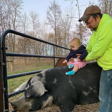 What would a farm be without a farm dog to keep an eye on everything? Echo is a purebred Rottweiler who is learning what it means to grow up on a farm. If he's not snuggling with his pal Nora, you can find him outside checking on the pigs!